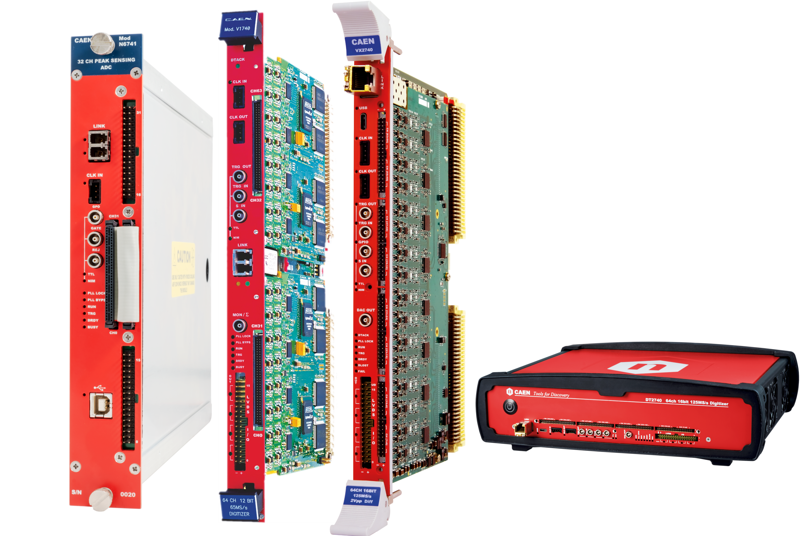 The 740 is a high channel density CAEN Waveform Digitizer family able to perform basic waveform recording and run online advanced algorithms (DPP) of charge integration. Both the elevate number of channels per board (32 for Desktop and NIM form factor, 64 for VME) and the DPP algorithm make the board a digital replacement of a traditional QDC. Data is read by a Flash ADC, 12-bit resolution and 62.5 MS/s sampling rate, which is well suited for mid-slow signals as the ones coming from inorganic scintillators coupled to PMTs, gaseous detectors and others. Sampling rate can be further reduced using the decimation feature. The acquisition can be channel independent and externally vetoed/gated. Multiple boards can be synchronized to build up complex systems.