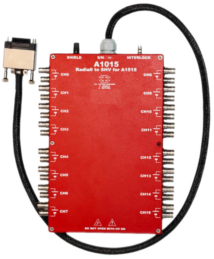 The CAEN Mod. A1015 is a 16 Floating Channel Multipin Radiall to SHV connector Adapter for the A1515 power supply series.