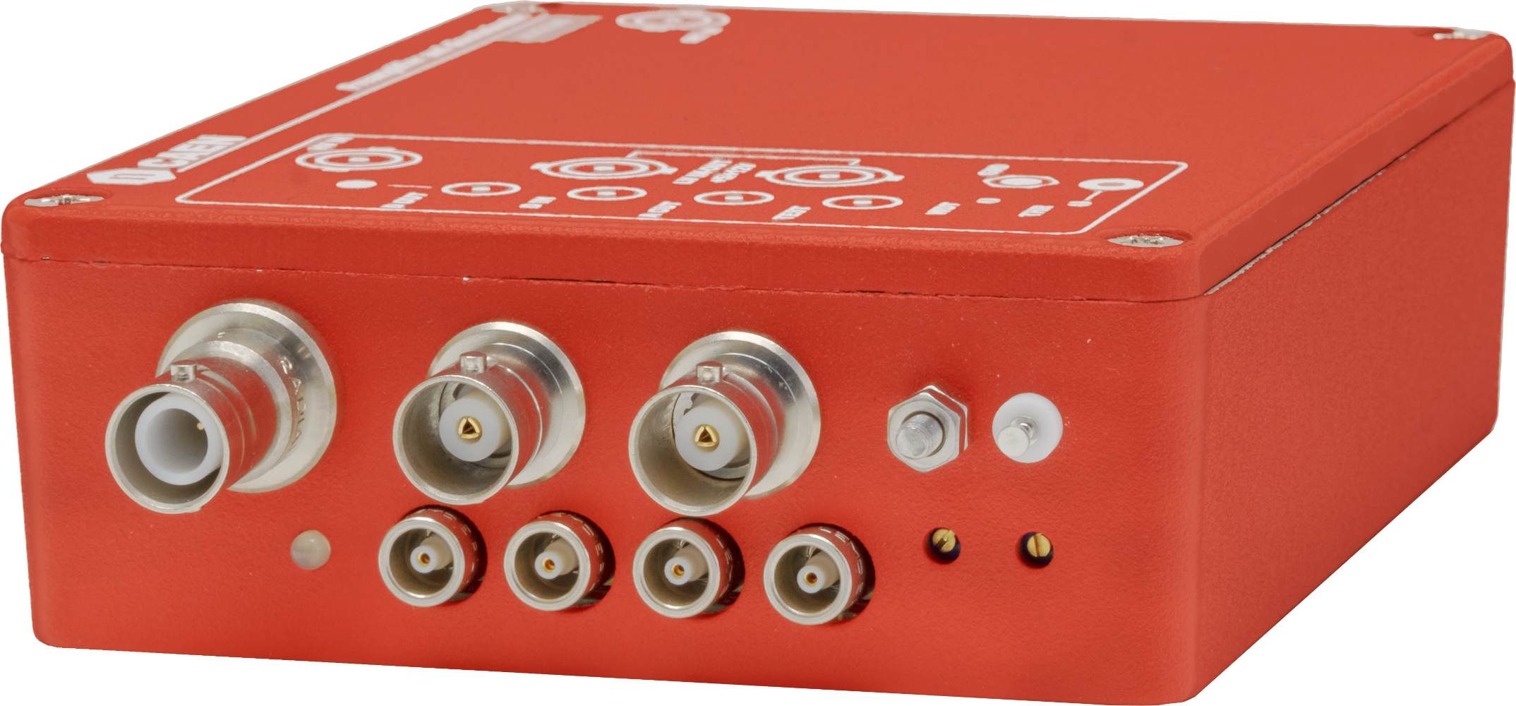 The device is equipped with a detector input on an BNC or HN connector and an external HV input on an BNC connector (which powers the internal decoupling circuits). Additionally, it features two rear 3-pin male connectors (ref.: RT3MP REAN) to power the preamplifier, also allowing for daisy-chain operation. It includes two trimmers to adjust the discriminator threshold and the discriminator output width. A digital input is available on a LEMO connector for cascading the summing of the discriminator signals.