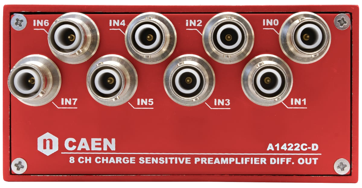 The CAEN Mod.A1422C/D is a 5 mV/MeV 8-channel preamplifier implemented into an alloy box and features SHV connectors for the DET/IN and HV/IN signals, 2 RJ45 for the differential outputs, LEMO connectors for the TEST IN and COM OUT and a cable with a D-type 9 pin male connector for the power supply. The module accepts both positive and negative input charge pulses and provide a differential output of ±5V max on 1 kΩ termination, and ±2.5V on 100 Ω back termination. A test input accepts positive and negative signals for calibration purposes. Moreover the sum of the 8 energy outputs, with 1 µs decay time, is available on the COM OUT output.