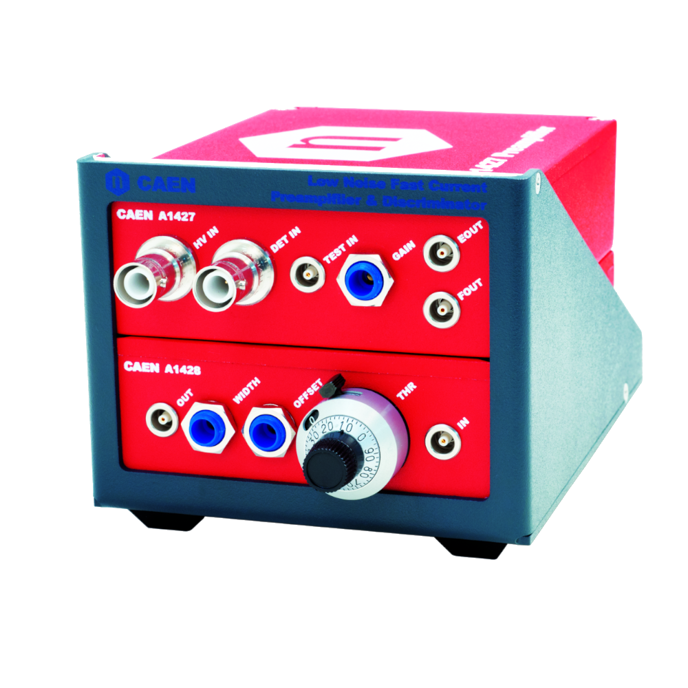 A1427 is a fast and low noise current preamplifier with AC coupled input. It hosts two outputs: EOUT (unipolar) that can be integrated to calculate the energy associated to the input signal and FOUT (bipolar) that can be used to calculate the rate of the input signal, discriminating the negative pole using the A1428 discriminator that is designed to fit with A1427. The discriminator thresholds is settable from -1 to -100 mV via a 10 turn rotary handle with lock.
