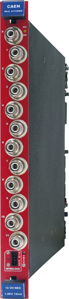 The CAEN Mod A1538D is a single width board (5 TE wide) that houses 12 independent high voltage channels.