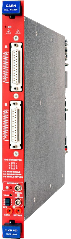 The CAEN Mod A1539B is a single width board (5 TE wide) that houses 32 independent high voltage channels.