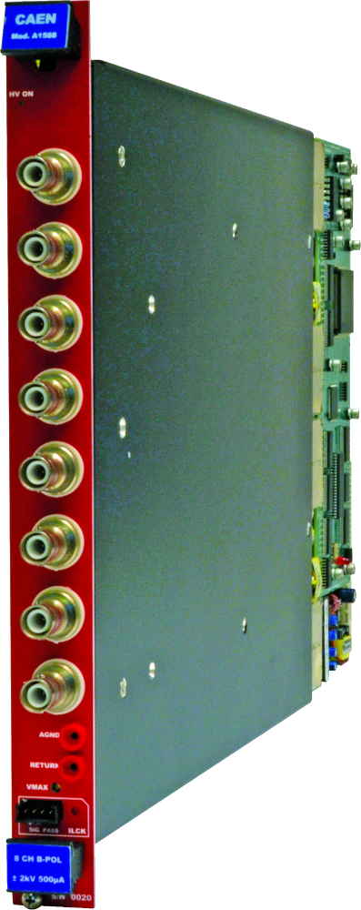 The A1588 board contains 8 independent channels providing high-voltage through SHV connectors; it is compatible with the CAEN Universal Multichannel Power Supply System (SY1527, SY2527, SY3527, SY4527, SY5527).