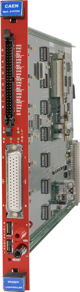 The CAEN Mod. A1676A EASY Branch Controller is implemented in a single width SYx527 board. Once plugged in, the Branch Controller must be linked to the EASY3000 and EASY4000 crates (which can work in the “hostile area”), via front panel connectors (Control and Power Supply). The A1676A is the interface between the mainframe and the remote boards in the EASY3000/4000 crate.