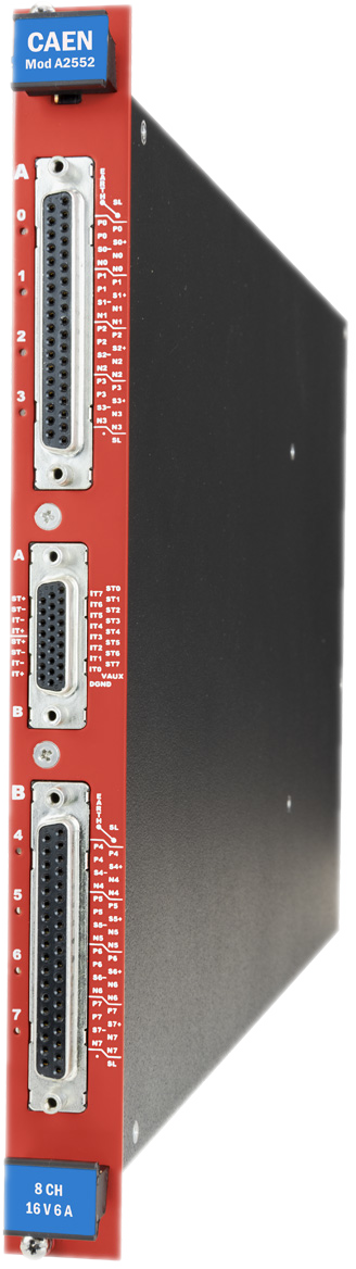 The power supply A2552 is a single width board (5 TE wide) that houses 8 independent Low voltage Individual Full Floating channels, compatible with the CAEN Universal Multichannel Power Supply System (SY4527, SY5527). The A2552 is available in different versions equipped with D-Sub 8-pin or with DB37 connector: