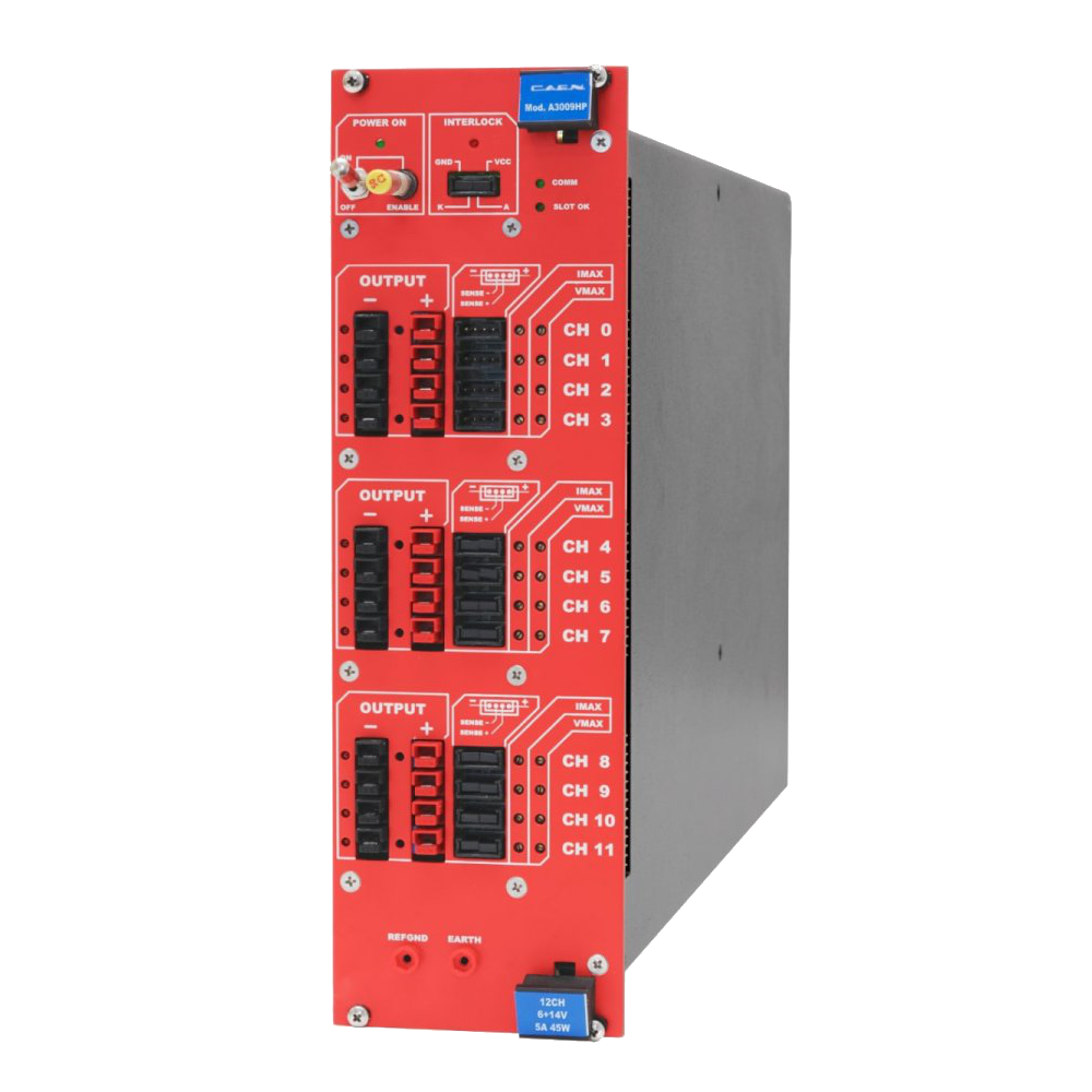The CAEN Mod.A3009H 12 Channel 14 V / 5 A Power Supply Board is developed for operation in magnetic field and moderate radioactive environment. One A3009H houses 12 positive 14 V / 5 A / 45 W maximum output power, channels. The connector output voltage range is 6 ÷ 14 V with 5 mV monitor resolution; channel control includes various alarms and protections. A 11.8V ± 0.1V hardware limit is available on request. The board is provided with Remote Sensing Lines to compensate for the voltage drop over the connection cables.