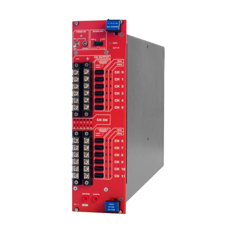 The CAEN Mod.A3009HB 12 Channel 14 V / 5 A Power Supply Board is developed for operation in magnetic field and moderate radioactive environment. One A3009HB houses 12 positive 14 V / 5 A / 45 W maximum output power, channels. The connector output voltage range is 6 ÷ 14 V with 5 mV monitor resolution; channel control includes various alarms and protections. A 11.8V ± 0.1V hardware limit is available on request. The board is provided with Remote Sensing Lines to compensate for the voltage drop over the connection cables.