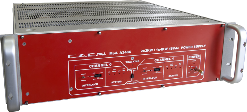 The CAEN Mod. A3486 is a two channel 400 Vac – 48 Vdc converter, which allows to integrate into the EASY channels control also the management of the 48 V Power Supplies. Each channel provides a 2 kW output (referred to earth) and can be tracked in order to obtain one 4 kW output. This module is designed to work as main converter in LHC hostile areas, thus completing the EASY system. Features include local or remote control, overload protection and local or remote inhibit function.