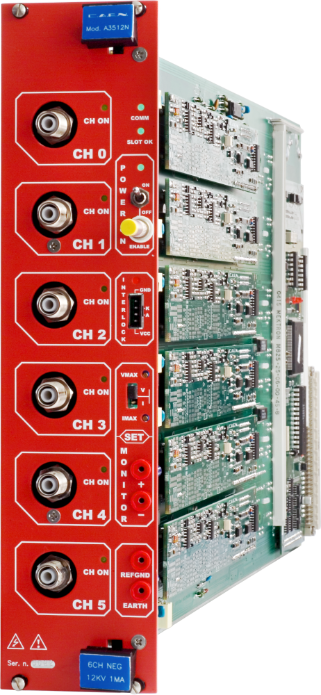 The CAEN Mod.A3512 12 kV / 1 mA Power Supply Board is developed for operation in magnetic field and radioactive environment. One A3512 houses 6 individual floating (up to 5 V between each other) 12 kV / 1 mA channels. The output voltage can be set with 1 V monitor resolution.
