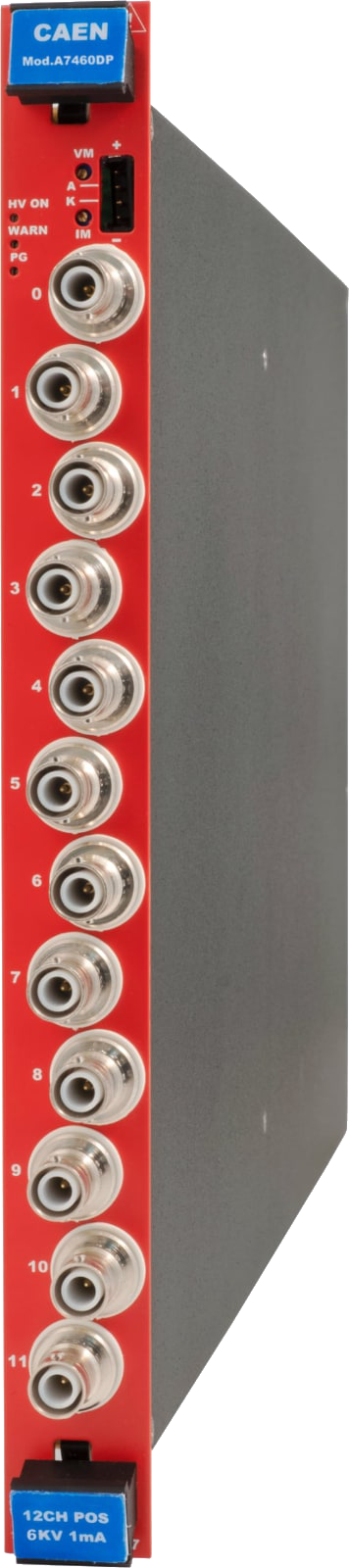 The CAEN Mod A7460 is a single width board (5 TE wide) that houses 12 independent high voltage channels.