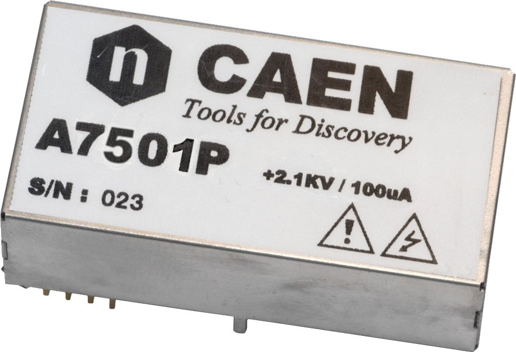 The CAEN Mod. A7501 is a high efficiency, low noise single channel High Voltage DC/DC converters in a PCB mount form factor. It provides a programmable and monitorable output voltage ranging from 0 to 2100 V, when supplied with a +12 V input. It is available with either positive or negative output voltage. The output voltage is regulated by providing a 0 to +2.5 V external voltage (Vset). The maximum output current is 100 µA, regulated by providing 0 to +2.5 V external voltage (Iset). The board is provided with an over-current protection: if a current larger than the Iout maximum value is drawn, the module is not being damaged.