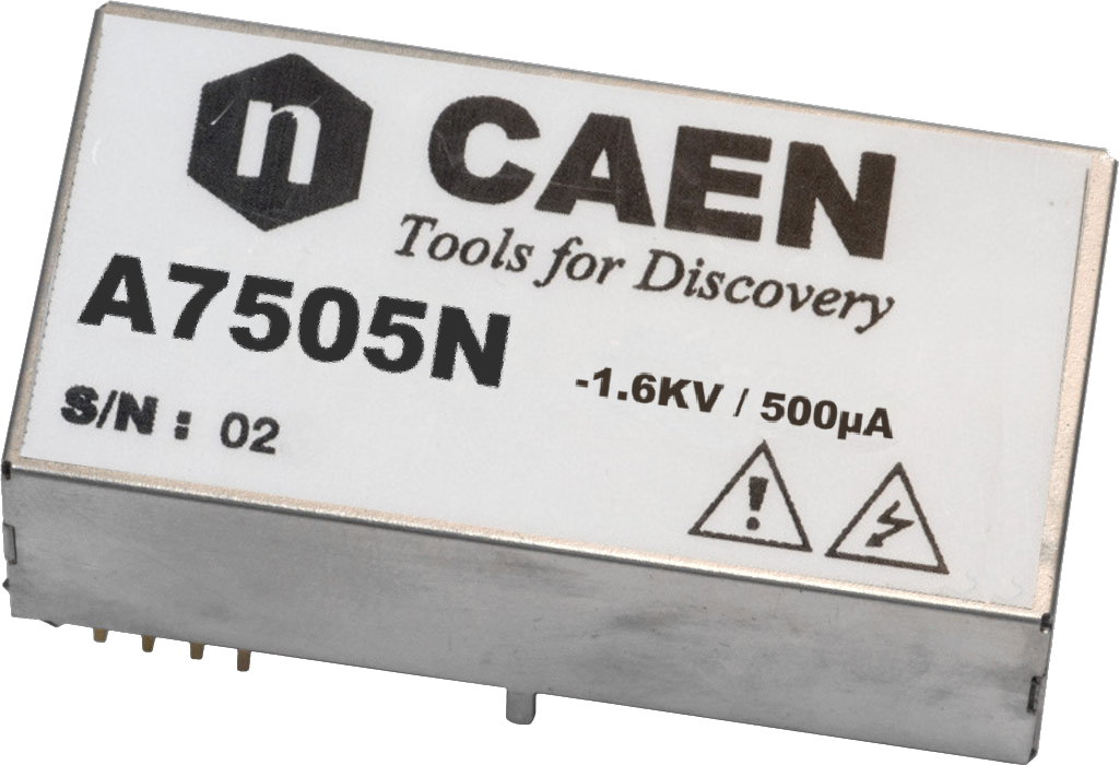 The CAEN Mod.A7505 is a high efficiency, low noise single channel High Voltage DC/DC converters in a PCB mount form factor. It provides a programmable and monitorable output voltage ranging from 0 to 1600 V, when supplied with a +12 V input. It is available with either positive or negative output voltage. The output voltage is regulated by providing a 0 to +2.6 V external voltage (Vset). The maximum output current is 500 µA, regulated by providing 0 to +2.5 V external voltage (Iset). The board is provided with an over-current protection: if a current larger than the Iout maximum value is drawn, the module is not being damaged.