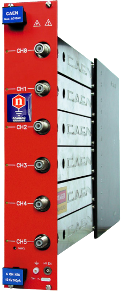 The CAEN Mod AG524 is a single width board (5 TE wide) that houses 6 independent high voltage channels.
