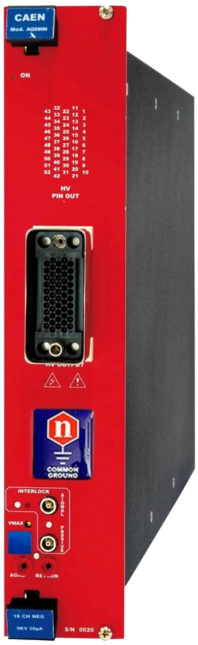 AG590 is a double width module (10 TE wide) that houses 16 Independent high voltage channel is delivered through Radiall 52 pin HV connectors. The board is available with either positive or negative output polarity. The channels share a Common Ground. The output voltage can be programmed and monitored in the 0 ÷ 9 kV range with 10 mV monitor resolution. The Maximum current full scale is 50 μA with 100 pA Iset/Imon monitor resolution.