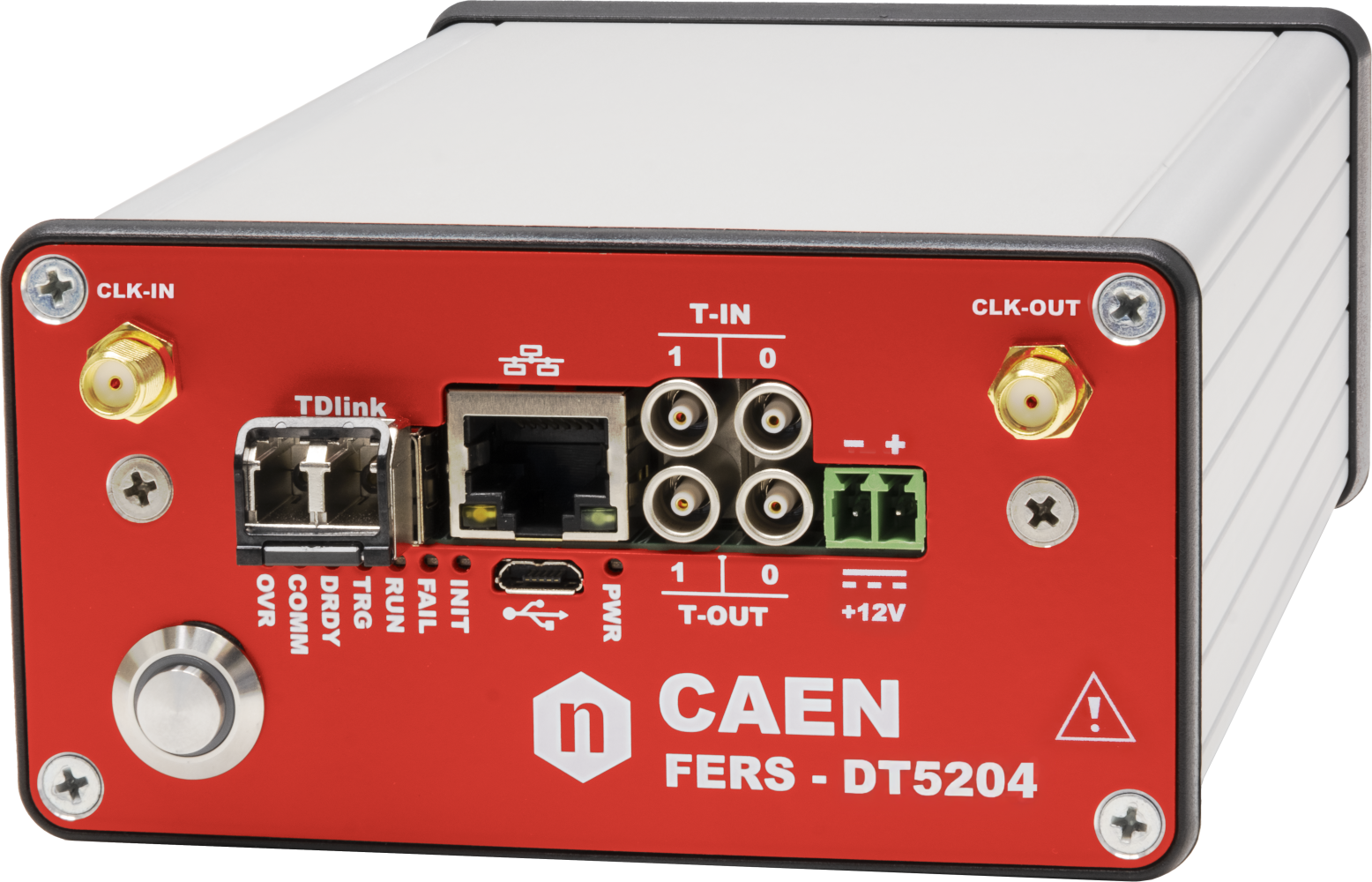 For small setups a single DT5204 unit can be used stand alone, without any additional hardware, by simply connecting the unit to a PC via USB 2.0 or Ethernet 10/100BASE-T. For large readout systems, a flexible and scalable network of units can be created by means of the high speed optical link called TDlink. The TDlink system supports up to 128 FERS units to be connected to and managed by one DT5215 FERS Data Concentrator Module. The TDlink supports optical daisy chaining and provides slow control, high speed data readout, synchronization between the units (clock and sync distribution), as well as command broadcasting for triggers, time resets, etc.
