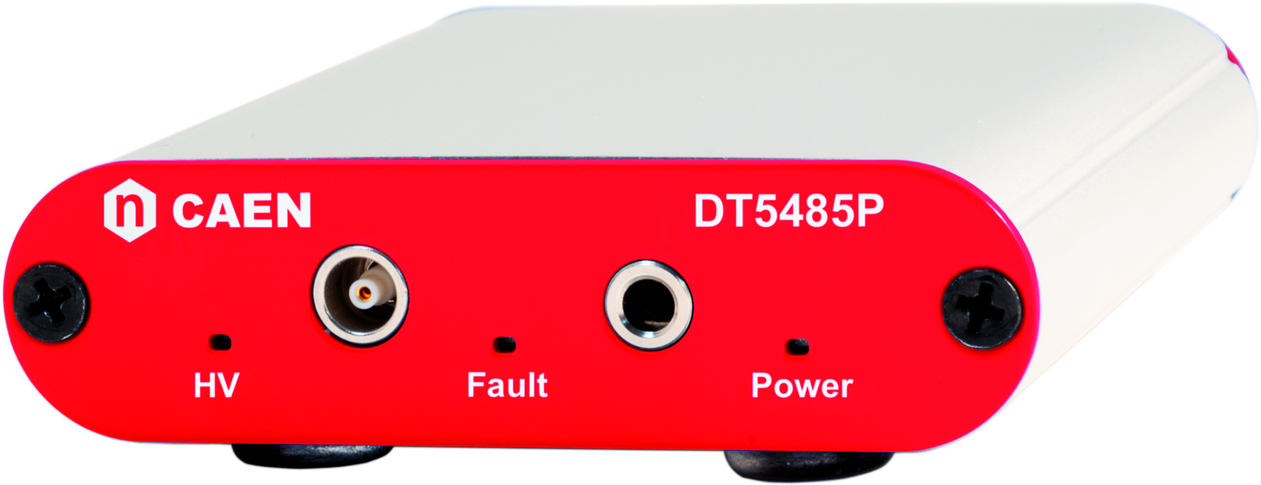 The DT5485P is a high voltage regulator specifically designed for SiPM bias. It has a built in temperature compensation controller with programmable coefficient (3.5mm audio socket for temperature probe input). Two versions are available: DT5485P (supplied and controlled via USB) and DT5485PB (USB controlled, with external +12V power supply). The unit can provide up to 10 mA and the output voltage could be regulated between 20V and 85V with a resolution of 1mV on a LEMO 00 connector. Moreover, the ZEUS control software is provided for free; ZEUS allows to monitor and control multiple modules at same time.