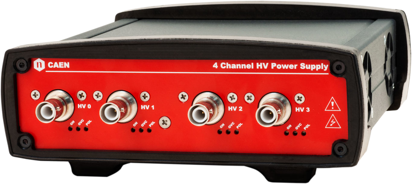 The CAEN Mod. DT5521E is a compact desktop module housing 4 independent High Voltage Power Supply Channels 6kV, 300 µA. The unit is available with either positive or negative output polarity; mixed version with 2 positive and 2 negative channels is also available. HV outputs are delivered through SHV connectors.