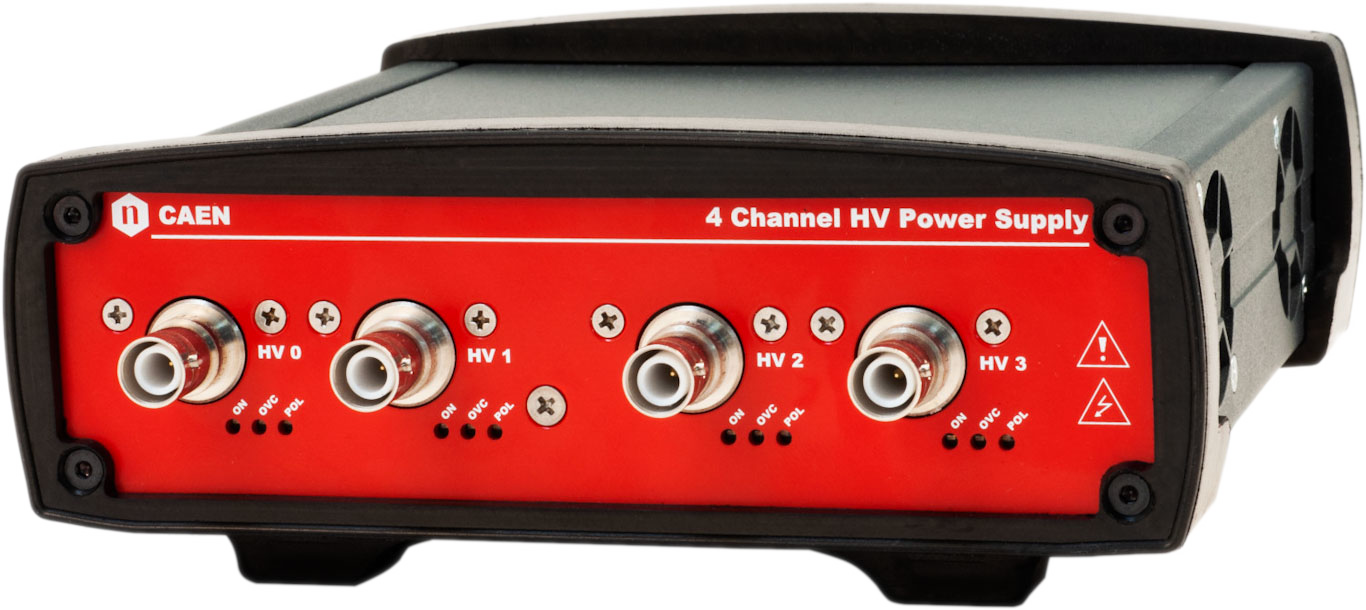 The CAEN Mod.DT5521HE is a desktop module housing 4 independent High Voltage Power Supply Channels 6 kV, 20 µA. The unit is available with either positive or negative output polarity; mixed version with 2 positive and 2 negative channels is also available. HV outputs are delivered through SHV connectors.