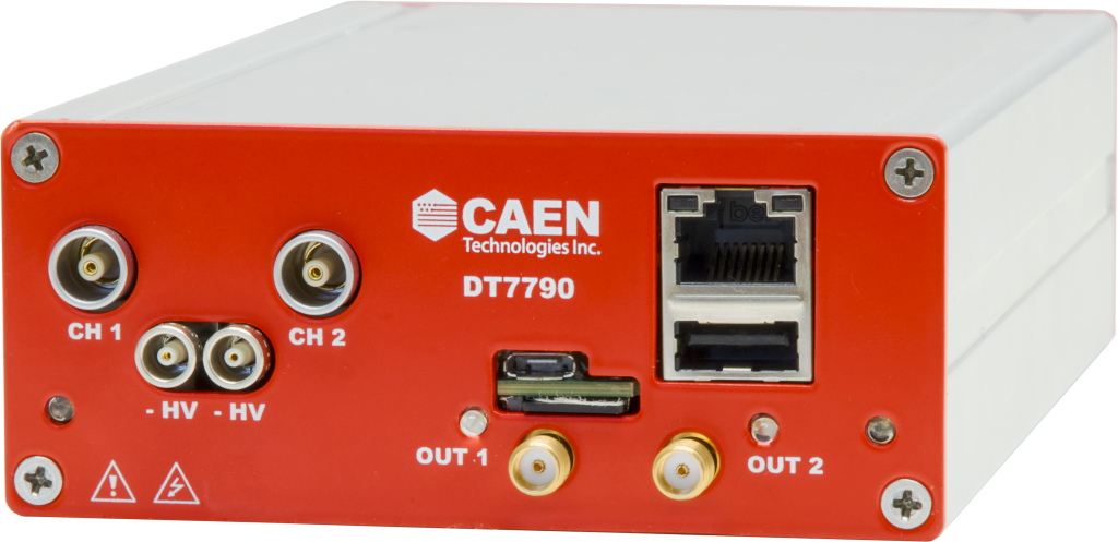 The CAEN Mod.DT7790 is a Desktop Dual Current Monitor for Nuclear Safeguards applications such as ion chamber gamma monitoring. The DT7790 has two independent inputs detecting currents in three user-selectable ranges that span from -100 fA to -800 μA. Data can be retrieved via an Ethernet connection or by monitoring the frequency of the TTL pulse stream on dedicated SMA connectors. In this way, the DT7790 can simplify instrumentation needs by enabling the use of a simple pulse counter for both neutron and gamma measurements. For added reliability, data are stored on dual redundant micro-SD cards and automatically downloaded onto a USB flash drive. The UDCM also features a programmable negative High Voltage (HV) power supply providing detector bias voltage from 0 to -1 kV.