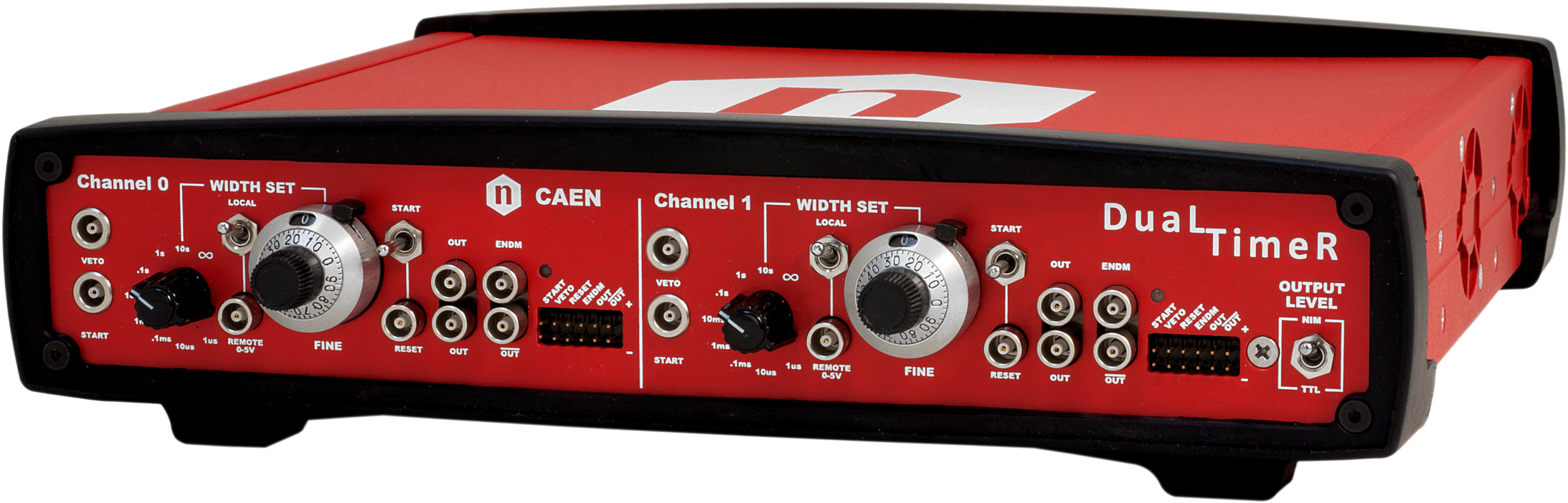 The CAEN Mod. DT993 Dual Timer is a desktop module housing two identical triggered pulse generators. The module produces NIM/TTL (NIM/TTL selection is performed via an on-board switch) and ECL pulses whose width ranges from 50 ns to 10 s when triggered. Output pulses are provided normal and negated. Timers can be re-triggered with the pulse end marker signal, a short pulse occurring at the end of each output pulse. The coarse adjustment of the output width is provided via a 9-position rotary switch, the fine adjustment can be performed via either 15 turn dial handle (with lock) or by providing an external voltage. The trigger START can be provided via either an external signal (NIM, TTL or ECL) or manually via a front panel switch. The module features also VETO and RESET input signals. RESET is also available on a front panel switch. The DT993 is equipped with LEMO 00 connectors for NIM/TTL signals and male pin couples for ECL signals.