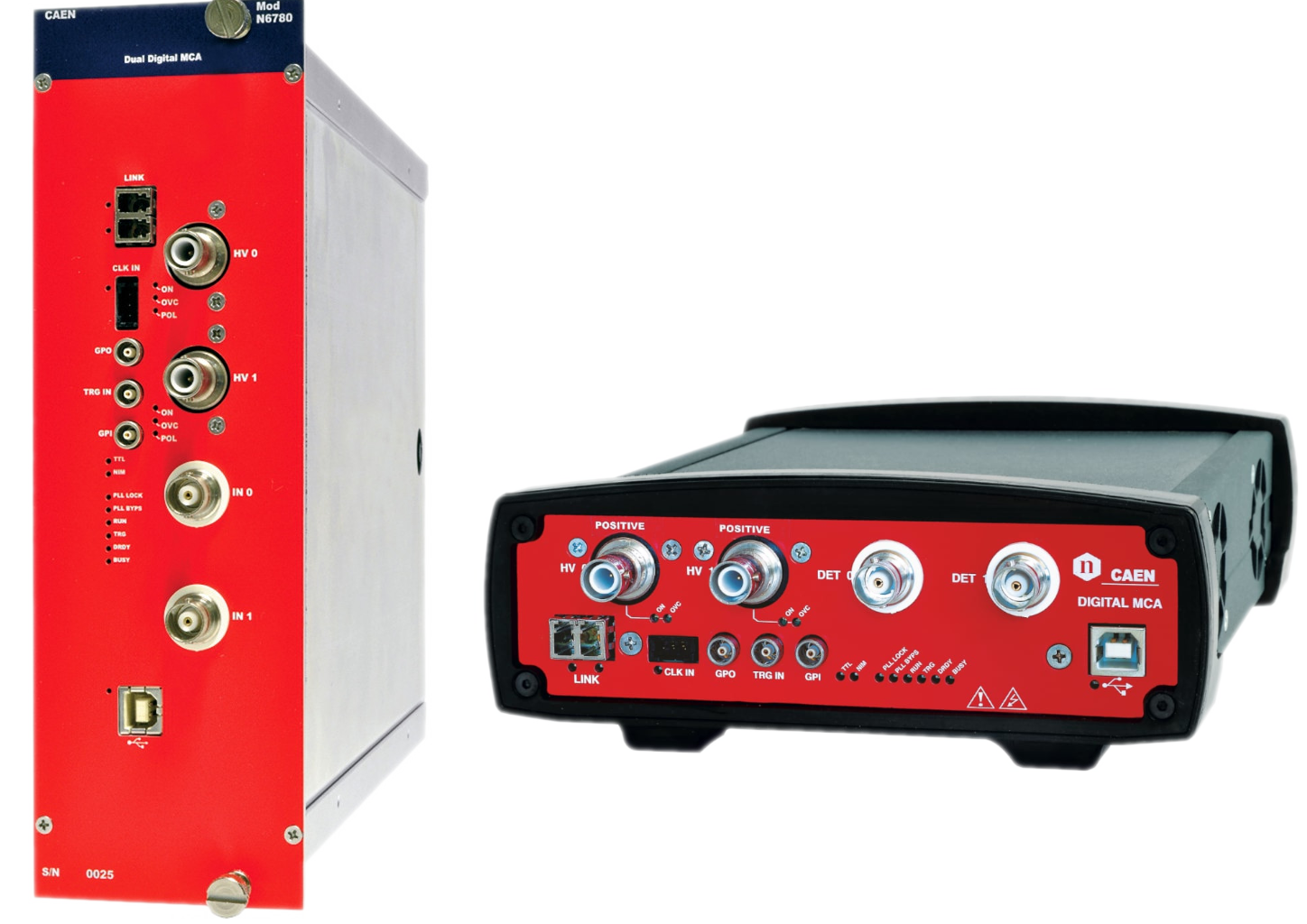 The 780 MCA family is composed by compact, stand-alone dual digital 16k MCA with integrated HV & Preamplifier Power Supply, available in desktop and NIM from factors. They are designed for high energy resolution semiconductor detectors, like HPGe and Silicon detectors with resistive feedback Charge Sensitive Preamplifiers. The 780 MCA family integrates advanced firmware algorithms operating Digital Pulse Processing for Pulse Height Analysis (PHA). The processing algorithms can be easily adapted to different detectors and application ensuring effective data analysis even at high count rates. It provides advanced tools for configuring baseline restoration, pile-up rejection. Thanks to the two input simultaneous acquisition, the modules are able to manage coincidence and anti-coincidence logic between detectors, allowing the user, for example, to easily take advantage of background rejection or anti-Compton techniques. These MCAs may provide at the same time energy, time stamp and the digitized pulse in a configurable time window (e.g. including the rising edge region) in order to perform further online analysis. Acquisition settings and basic mathematical analysis are performed through the CoMPASS and MC2Analyzer software, providing energy spectra with up to 16k channels, which can be exported and imported in ASCII or N42.42 compliant files.CAEN further provides drivers for the supported communication interfaces; configuration software tools, C and LabVIEW libraries (CAENComm, CAENDigitzer, CAENDPP), demo applications and utilities.