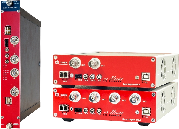 The CAEN 781 MCA family is composed by compact, stand-alone Dual or Quad independent 16k digital MCA, available in Desktop and NIM form factors.They are designed for high energy resolution semiconductor detectors, like HPGe and Silicon detectors with resistive feedback Charge Sensitive Preamplifiers. The 781 MCA family integrates advanced firmware algorithms operating Digital Pulse Processing for Pulse Height Analysis (PHA). The processing algorithms can be easily adapted to different detectors and application ensuring effective data analysis even at high count rates. It provides advanced tools for configuring baseline restoration and pile-up rejection. Thanks to the multiple input simultaneous acquisition, the module is able to manage coincidence and anti-coincidence logic between detectors, allowing the user, for example, to easily take advantage of background rejection or anti-Compton techniques.