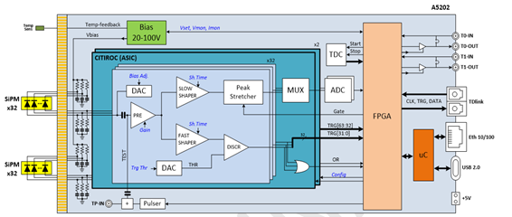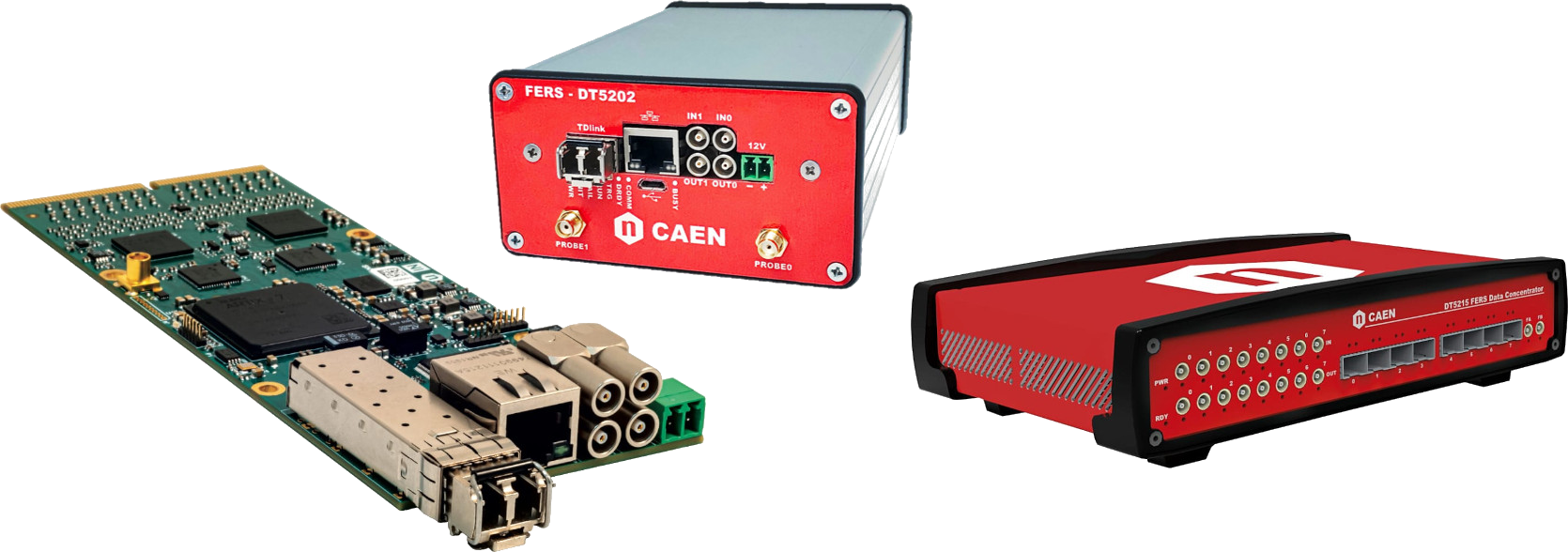 For prototyping and R&D, all that is required is a single A5202 – standalone FERS Unit connected to a computer via USB 2.0 or Ethernet 10/100T (boxed version DT5202 for desktop use also available). This offers a low cost, easy-to-use option to evaluate the system and the ASIC chip housed in the FERS unit.  When the solution is validated, it becomes extremely quick and easy to scale up by way of connecting multiple FERS unit to a Concentrator board via optical TDlink.  TDlink is the critical physical connection that guarantees high throughput data readout, accurate timing synchronization, and slow control.