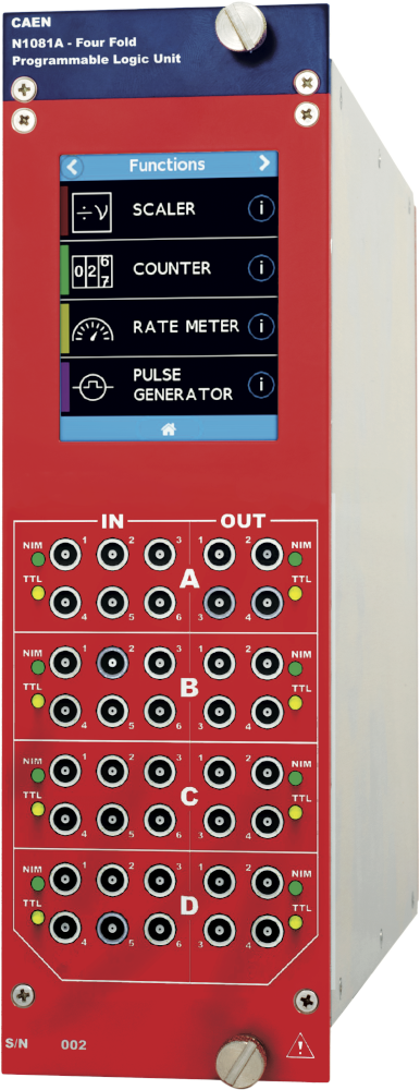The module is organized in four sections, with 6 inputs and 4 outputs each (selectable impedance) accepting TTL/NIM signals. Each section is configurable independently according to one of the available pre-programmed functions, like scaler, counter, time stamping, digital pulse generator, etc. The section programming can be done using the 2.8” touch screen display or via the web-interface. Each section integrates a programmable voltage threshold for analog input signals and an asynchronous Gate&Delay. This allows the user to trim at best the needed parameters and to perform accurate measurements.