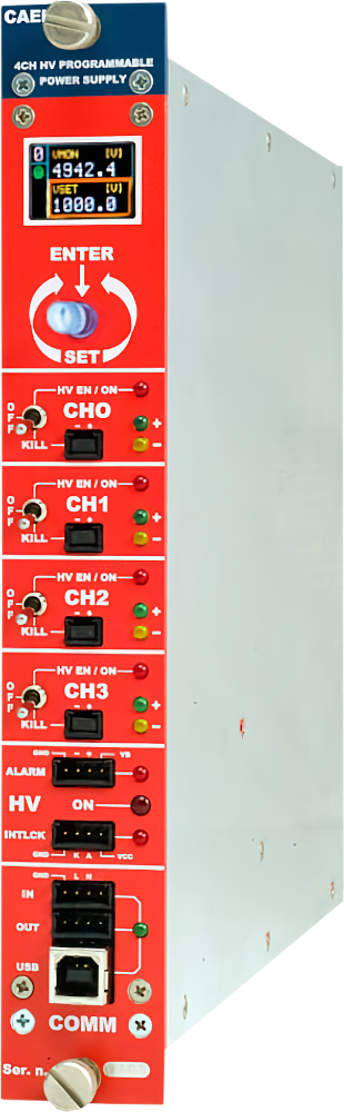 The Mod. N1408 provides 4 independent High Voltage channels in a single width NIM mechanics. Each channel can provide a ±800V / 20 μA max output.
