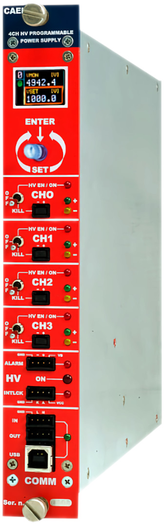 Power supply control can be performed either locally, assisted by a Graphic color display or remotely, via USB, RS232 or RS485, the latter allowing to build a daisy chain network of modules N14XX. It is also controllable via TCP/IP by the Smart Fan Unit of CAEN NIM8301.