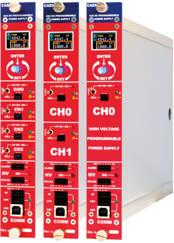 The CAEN Mod. N1419 provides 4 independent High Voltage channels in a single width NIM mechanics. Two and one channel versions (N1419A and N1419B) are also available. Each channel can provide a ±500 V max voltage, a 200 µA max current. The output polarity is independently selectable for each channel.