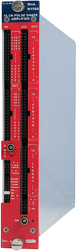 The CAEN Mod. N1568A is a 16 channel Programmable Spectroscopy Amplifier and Dual 16Ch CFD (30% and 80% constant fraction) implemented in a single-width NIM module.
