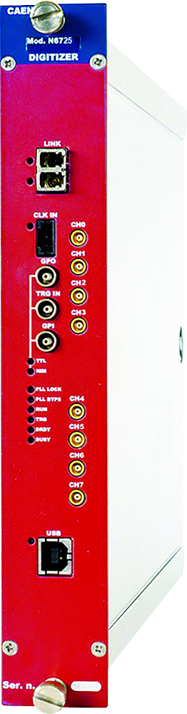 The N6725S family comes in a NIM form factor, with 8 input channels. The communication to and from the board is provided through the USB and Optical Link interfaces.
