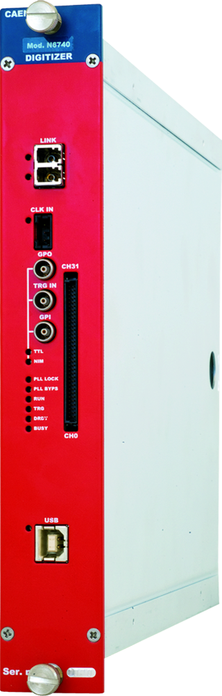 The N6740D is a 32ch 12 bit 62.5 MS/s (65 MS/s using external clock) NIM Waveform Digitizer with 2 Vpp single ended input dynamics on a ERNI SMC connector. 32 channels can be available on LEMO connectors using the A746D adapter.
