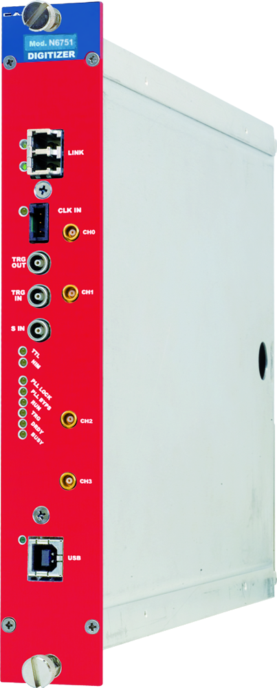 The CAEN Mod.N6751 is a digitizer able to record waveforms along with performing advanced algorithms for online digital pulse processing (DPP) of charge integration and pulse shape discrimination with constant fraction timing and zero-length encoding.