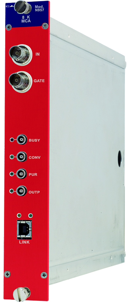 The Mod. N957 is a 8k Multi-Channel (MCA) with USB port, housed in a 1-unit wide standard NIM module. The multichannel analyzer performs the essential function of collecting the data and producing output, in the form of converted value of input peaks. The input pulses can be those produced by a standard spectroscopy amplifier. They can be Gaussian, semi-Gaussian or square waves, unipolar (positive) or bipolar, in a range from 0 to 10 V, with a rise time greater than 0.1 µs. The trigger can be made “on signal” (Auto Gate mode) or “external” (External Gate mode). In the first case a discriminator, with a settable threshold, enables the conversion. In the second case, an external gate is fed to the module, via front panel GATE In connector. The input channel has one peak amplitude stretcher, the output of which is digitised by a 13 bit fast (0.8 ms) ADC featuring a sliding scale technique, to improve the differential non-linearity. Converted waveforms are stored into a 64 KSamples buffer memory. The unit hosts an USB2.0 port (also compatible with USB 1.1), which permits a simple control and data-acquisition via PC.