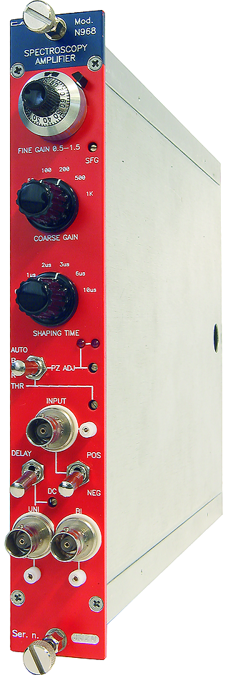 The CAEN Mod.N968 is a spectroscopy amplifier implemented in a one unit wide NIM module. It accepts the typical outputs generated from either optical feedback or resistor feedback preamplifiers connected with nuclear particle detectors. The output is Quasi-Gaussian with 0 to +10 V output dynamics.