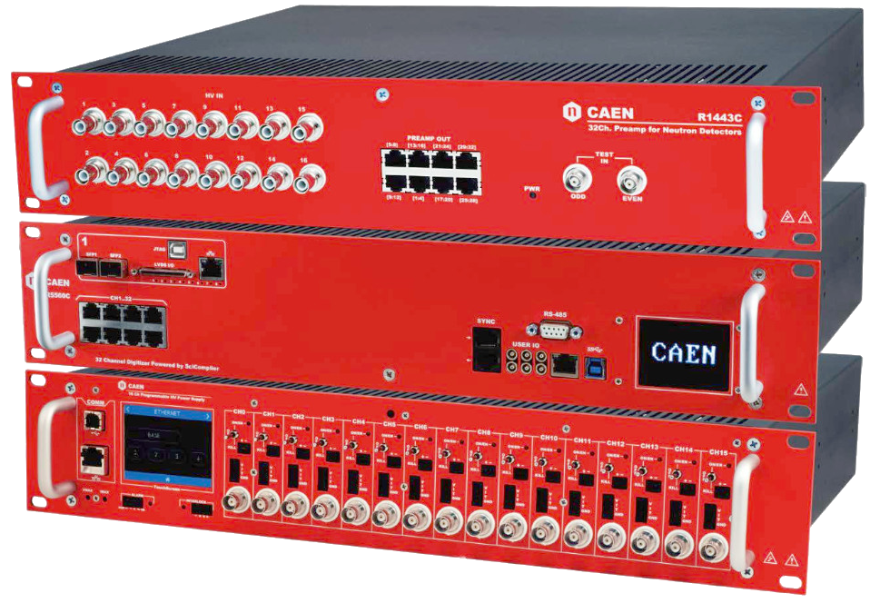 The three units combined together build a complete readout system for neutron detection applications, allowing for the readout of up to 16 position-sensing 3He/BF3 tubes.