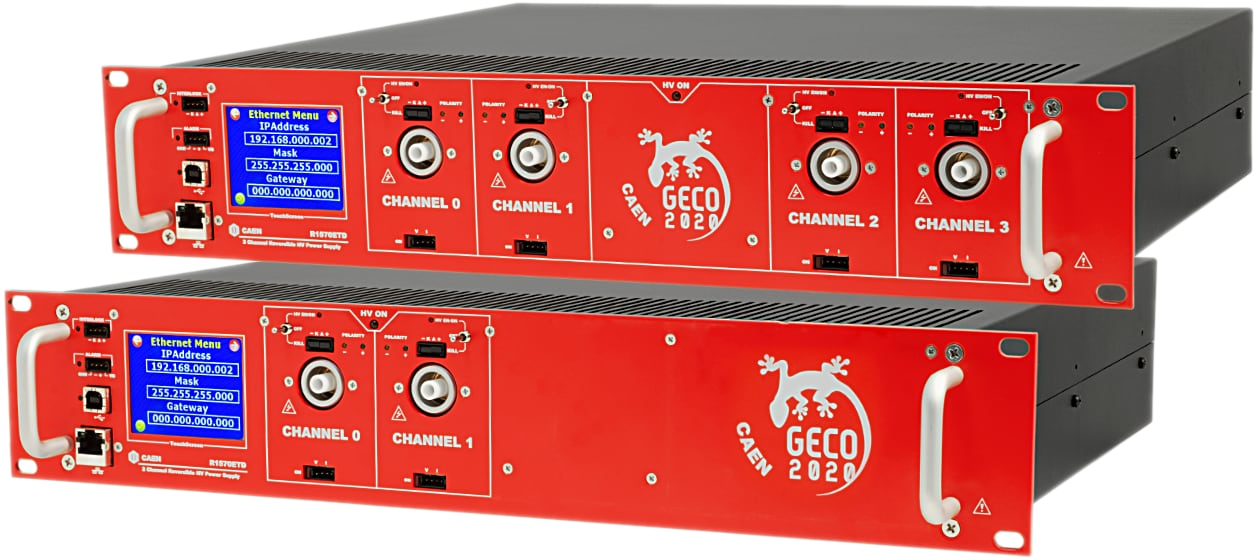 The CAEN Mod.R1570ET provides 4 or 2 (depending on version) independent High Voltage channels in a 19โณ rack unit (110/220V AC Powered). Each channel can provide a ยฑ 15 kV max voltage, 1 mA max current and a 10 W max power. The output polarity is independently selectable for each channel. Channels have common floating return (common return insulated from the crate ground); HV outputs are delivered through Lemo HV connectors.