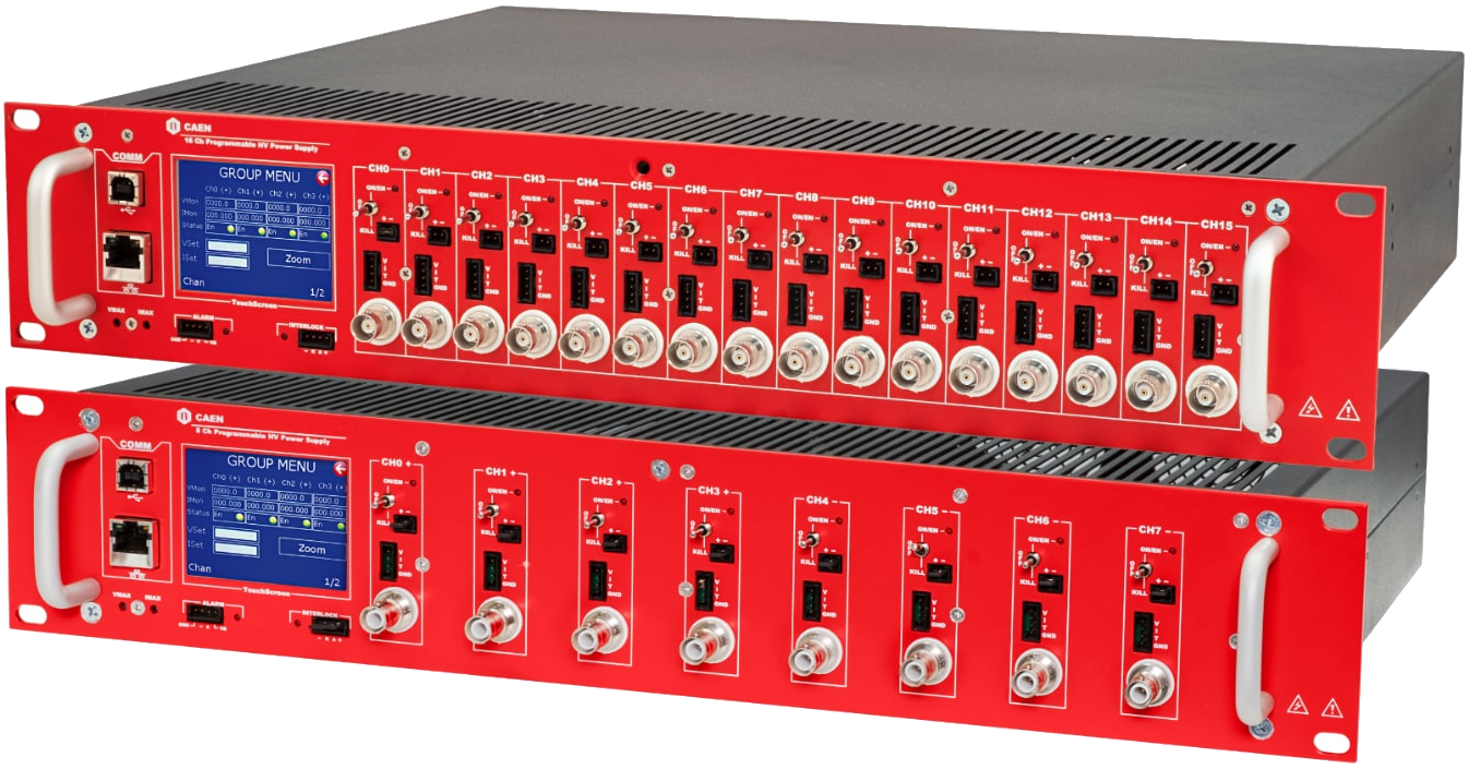 The CAEN Mod. R8033 provides 8 or 16 independent 4 kV / 3 mA (6W) channels in a 19″ rack unit (110/220V AC Powered). Each channel can provide a 4 kV max voltage and a 3 mA max current (up to 6W). The unit is available with positive, negative and “mixed” (4-8 positive and 4-8 negative) channels. Channels outputs are delivered through SHV connectors. The HV output RAMP-UP and RAMP-DOWN rates may be selected independently for each channel in the range 1÷500 V/s in 1 V/s steps. The module features 10 nA Iset resolution.