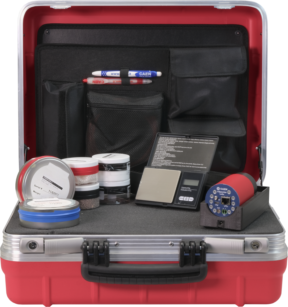 • To increase the familiarity with this field CAEN provides a kit of samples, suitable for gamma environmental detection. The kit is composed of an LYSO scintillating crystal, two charcoal canisters, a test sample, a fertilizer sample, a rock sample, an empty beaker, mechanics support, a portable digital pocket scale, and adhesive tape. Teaching and training experiences are performed starting from acquiring gamma spectra to study the emission and the composition of different sample and radon passive measurement.