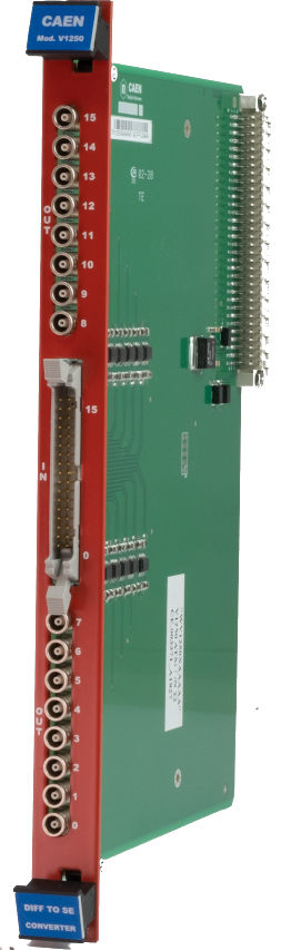 The CAEN Mod. V1250 is a 16 channel differential to single ended signal converter in a 1-unit wide VME 6U form factor. It provides differential inputs (34-pin 2.54 mm header, Zdiff = 100 Ω) and single ended outputs (coaxial LEMO, Rout = 50 Ω).
