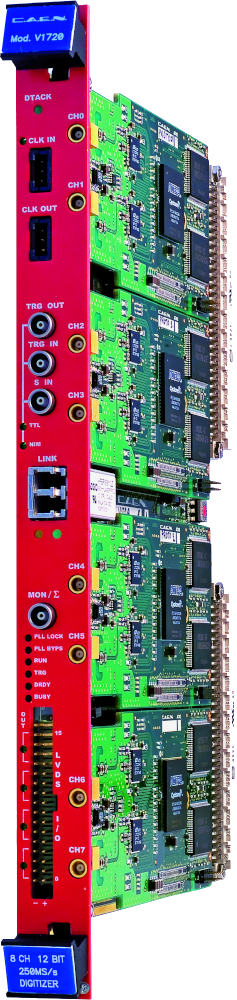 The CAEN Mod. V1720 is a 1-unit wide VME 6U module housing a 8 Channel 12 bit 250 MS/s Flash ADC Waveform Digitizer and featuring 2 Vpp single ended input dynamics.