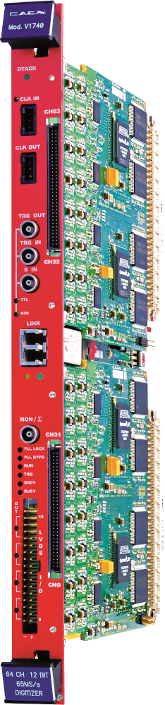 The V1740 is a 1-unit wide VME 6U module housing a 64 Channel 12 bit 62.5 MS/s (65 MS/s using external clock) Flash ADC Waveform Digitizer and featuring 2 Vpp single ended input dynamics on two ERNI SMC connectors. Versions with 10 Vpp (single ended) input full scale range are also available (V1740A/V1740C).