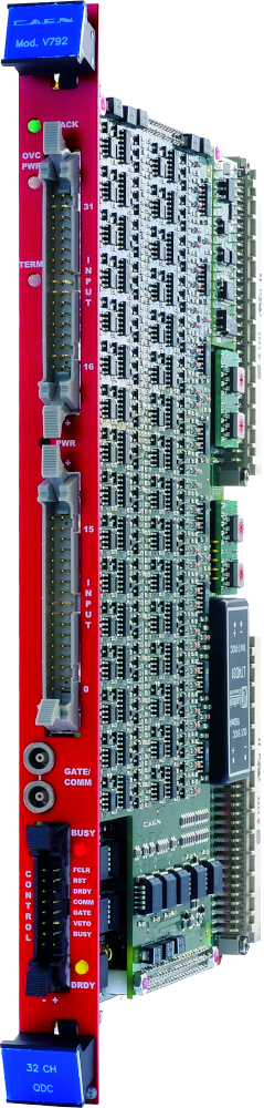 The Mod. V792 is a 1-unit wide VME 6U module housing 32 Charge-to-Digital Conversion channels with current integrating negative inputs (50 ฮฉ impedance).