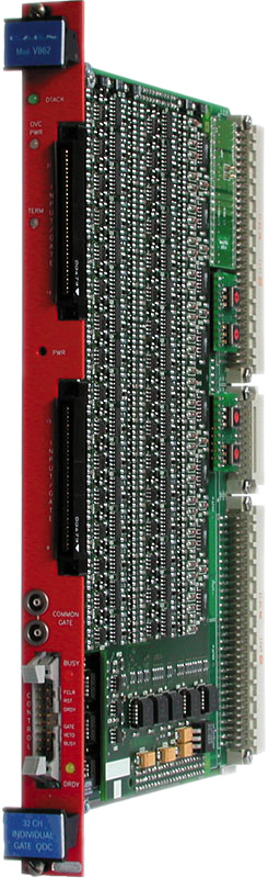 The Model V862 is a 1-unit wide VME 6U module housing 32 Charge-to-Digital Conversion channels with current integrating negative inputs. Each channel has an independent gate input (GATE i) logically ANDed with a COMMON GATE input; the input charge on the i-th channel is converted to a voltage level by a QAC (Charge to Amplitude Conversion) section when both the GATE i and COMMON GATE signal are active. Input range is 0 ÷ 400 pC.