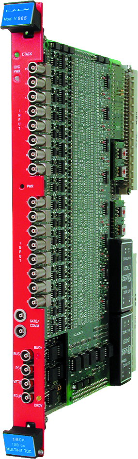 The Mod. V965 is a 1-unit wide VME 6U module housing 16 Charge-to-Digital Conversion channels with current integrating negative inputs (50 Ohm impedance). For each channel, the input charge is converted to a voltage level by a QAC (Charge to Amplitude Conversion) section. Each QAC output is then converted by two ADCs in parallel; one ADC is preceded by a x1 gain stage, the other by a x8 gain stage: a dual input range is then featured: 0 ÷ 900 pC (200 fC LSB) and 0 ÷ 100 pC (25 fC LSB); this allows to avoid saturation with big charge pulses while increasing resolution with small ones.