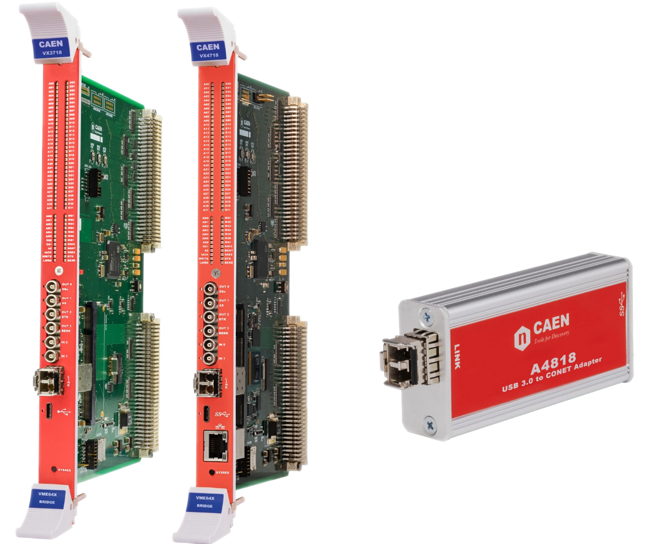 CAEN offers controllers in VME, Desktop and PCIe form factors with USB C (2.0 or 3.0) and Gigabit Ethernet interfaces for better compatibility with host devices, also in a small form factor (A4818) simplifying the use in mobile environments.