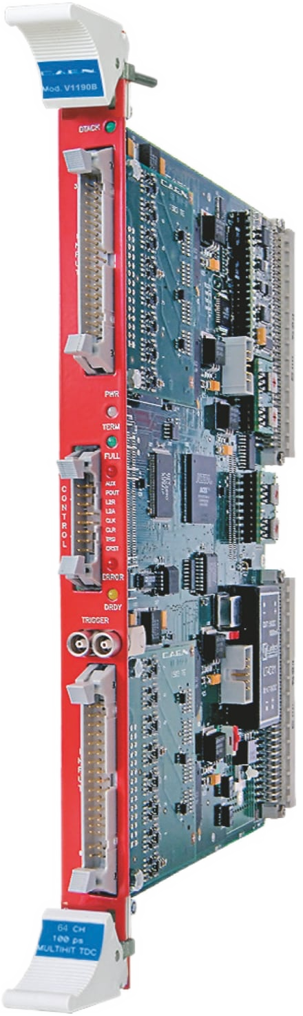 The CAEN Mod. VX1190B-2eSST is a 64 channel Multihit TDC, housed in a 1-unit wide VME64X 6U module. The unit features High Performance Time to Digital Converter chips developed by CERN. LSB can be set at 100 ps (19 bit resolution, 52 µs FSR), 200 ps (19 bit, 104 µs FSR) or 800 ps (17 bit, 104 µs FSR).